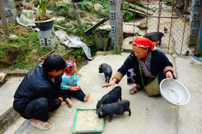 Arrivés (enfin) à notre destination après 15 longs kilomètres de marche sous la pluie, le brouillard et la chaleur, nous posons bagages dans la maison d'une famille "Red Dao" où nous allons passer la nuit (défi 1 de Robin réalisé). Il est difficile voire impossible de décrire cette maison tant l'endroit était inimaginable pour nous occidentaux. A l'extérieur se mêlaient cochons, poules et chats, et à l'intérieur tout était modeste et sombre... Mais notre chambre était propre et on a adoré tout de suite être dans cet endroit. On a pu en savoir plus sur cette communauté en discutant avec nos hôtes qui ont appris l'anglais grâce aux touristes, à qui elles essayent de vendre leurs créations. Une des femmes raconte à Marina qu'elle s'est mariée jeune, trop jeune selon elle, à 19 ans. Elle "aimerait changer de mari mais ce n'est pas facile" :-) elle a deux enfants et lui a expliqué qu'elle était heureuse de ne pas en avoir plus, car elle peut ainsi mieux s'en occuper et les envoyer à l'école. Une de ses amies en a 14! Oui, 7 garçons et 7 filles, et pour leur famille c'est très difficile... On imagine! Les "Red Dao" comme les "Black Mhongs" se soucient de leur apparence et aiment être jolies. Les critères de beauté sont différents des notres, par exemple, les "Red Dao" se rasent les sourcils et les cheveux à leur mariage. Nous avons aidé les femmes a cuisiner (défi 2 de Robin réalisé). C'est fou, on est coupé du monde, dans un endroit quasiment spartiate, mais on a le droit a un véritable festin, cuisiné avec des produits plus que frais. Durant le repas, le chef de famille faisait que de nous servir de l'alcool de riz maison : "Si un jour on nous avait dit qu'on allait picoler de l'alcool de riz, au fin fond du Vietnam, dans une maison d'une minorité ethnique... On ne l'aurai jamais cru !". C'est beau la vie quand même... L'échange avec ses gens a été si intense pour nous. On ne l'oubliera jamais !